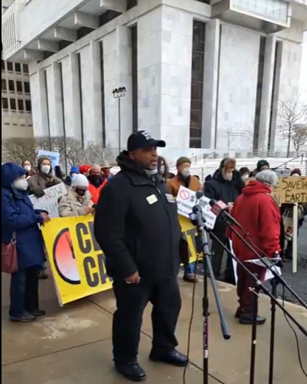 Merton Simpson, Albany County Legislator and SHARE Co-Chair, was a featured speaker at the Climate Can’t Wait 2022 mobilization at the NYS Capitol and Empire State Plaza Concourse held on January 25, 2022 to demand that the state legislature and governor prioritize climate in the 2022 budget and legislative session.